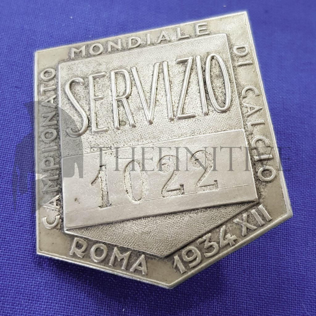 A forma di scudo pentagonale, con il vertice in basso, il distintivo è stampato e controstampato in rilievo, riporta la dicitura SERVIZIO al centro, ed intorno ai cinque lati leggiamo CAMPIONATO MONDIALE DI CALCIO ROMA 1934 XII . Al centro è stato impresso il numero di assegnazione univoco 1022