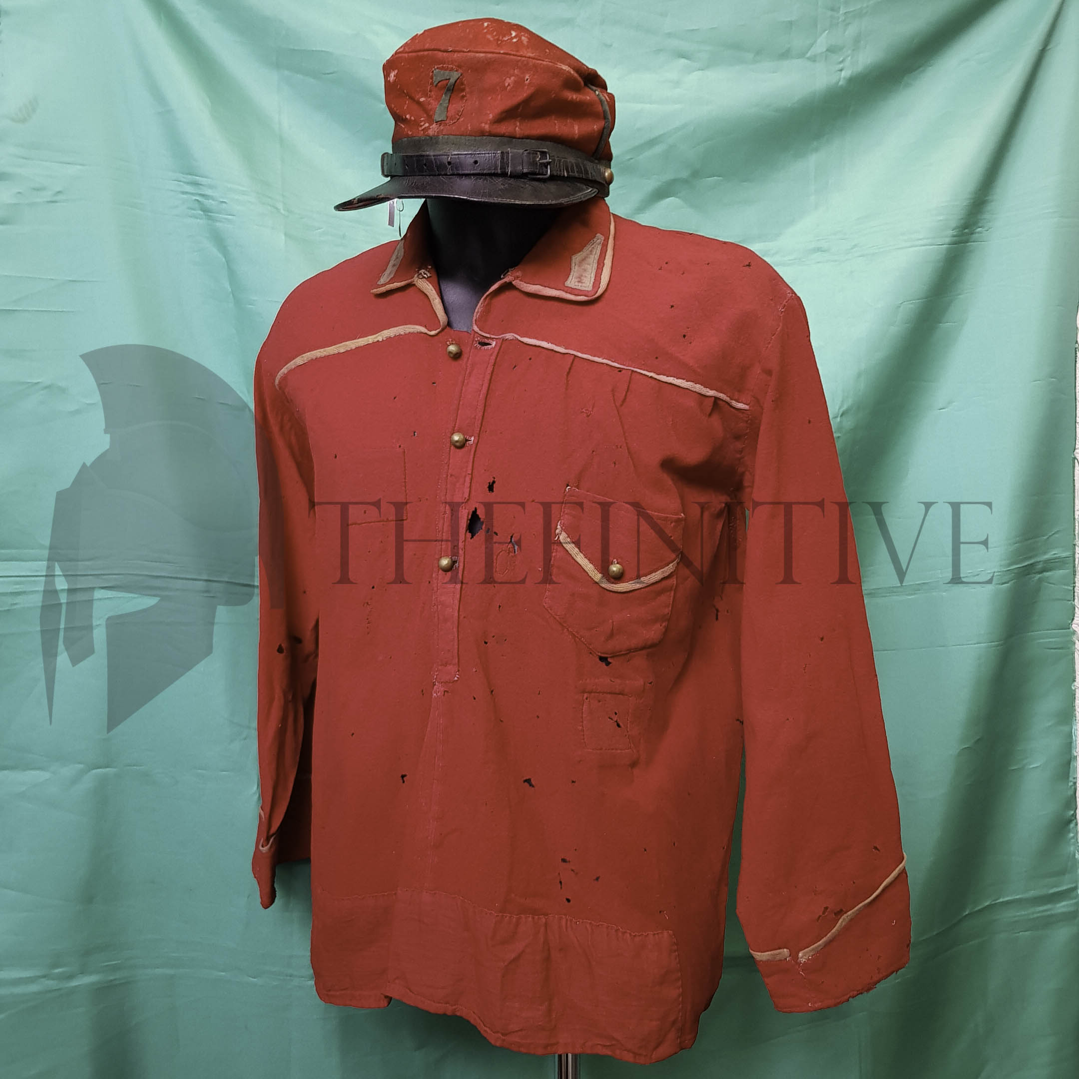 Camicia rossa originale appartenuta ad un garibaldino, periodo 1866 – 1870 , dopo la spedizione dei MILLE di Giuseppe Garibaldi . In panno rosso, con le peculiarità delle camicie dell’epoca ovvero con profilature gialle al taschino sul petto, sui baveri del collo, ed ai polsini. Apertura al collo con tre bottoncini in metallo dorato, come il bottoncino al taschino. Porta due mostrine di reparto di appartenenza ai baveri, ma dato lo scolorimento sofferto, non si evidenzia alcun numero, o simbolo. La camicia è evidentemente usata, e porta i segni inequivocabili del tempo e soprattutto delle battaglie combattute, avendo subito dei rammendi e dei rattoppi in corrispondenza di quelle che sono state le lacerazioni dovute probabilmente a colpi di arma da fuoco o da taglio. Assolutamente ricca di storia e di fascino, questa camicia da garibaldino è stata usata durante la spedizione dei Mille sbarcati a Marsala, e poi successivamente nelle altre campagne condotte agli ordini del generale Garibaldi, 1866-1870. Le condizioni di conservazione sono quelle ben visibili in foto, ma per un oggetto con 159 anni sulle spalle … possono essere sicuramente accettabili. Camicia di un volontario garibaldino del quale verrà fornito anche il nominativo (solamente a vendita conclusa) avendo sul sito altro suo materiale.
