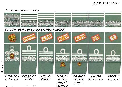 Come si evidenzia nello schema seguente, la greca seguita da due galloncini era per il grado di Generale di Divisione, ma l’aquila in colore argentato viene sostituita da un’aquila in colore dorato dal grado di Generale di Corpo d’Armata in poi.