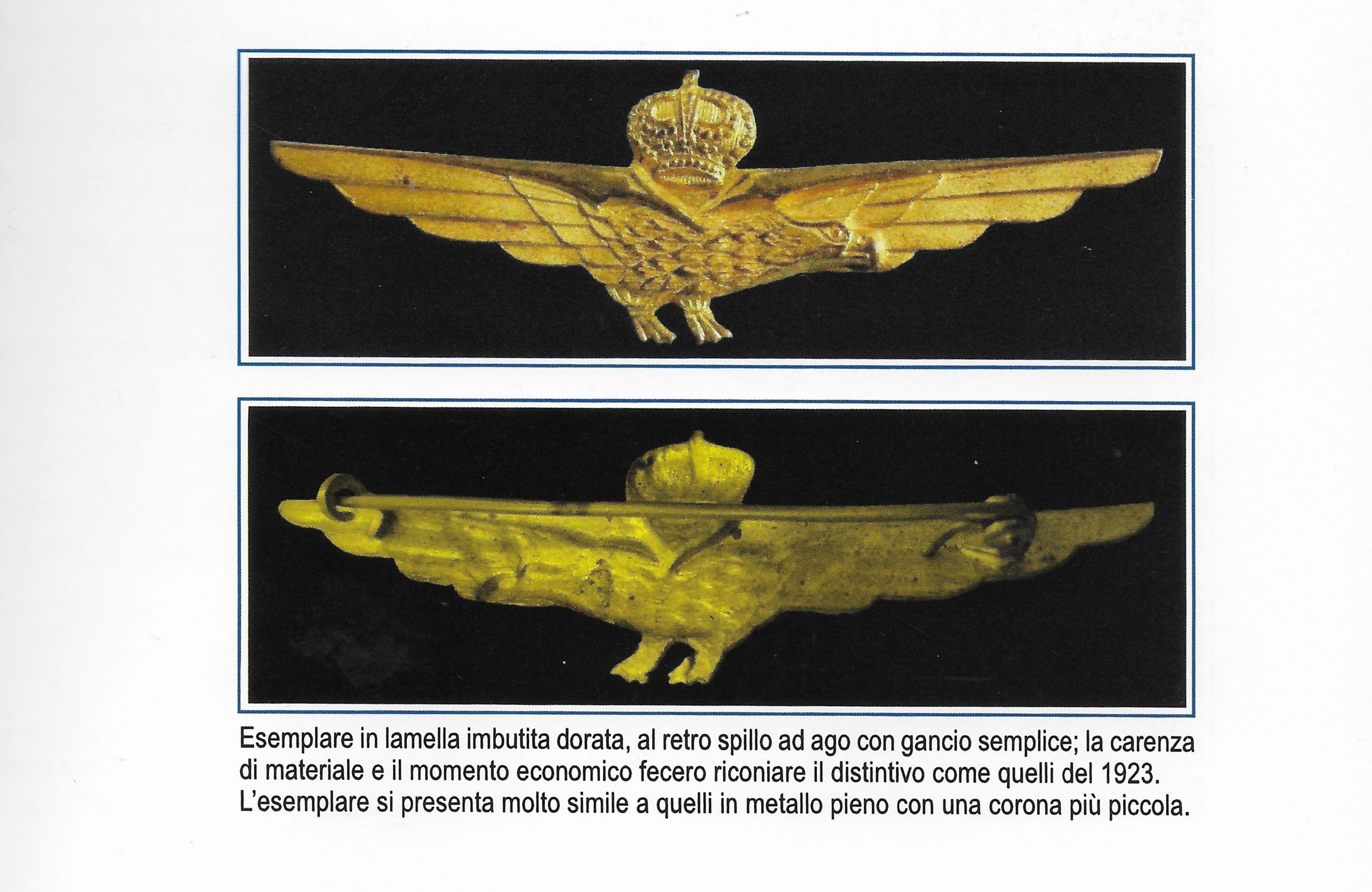 Il nuovo brevetto presentava un’aquila dal corpo più grande e gli artigli più grandi e definiti, come raffigurato anche in questa foto tratta dal volume “Storia e gloria delle aquile 1906-1946” (L.Cassioli – G.Del Gais) , e come effettivamente riscontrabile nel nostro esemplare in vendita.