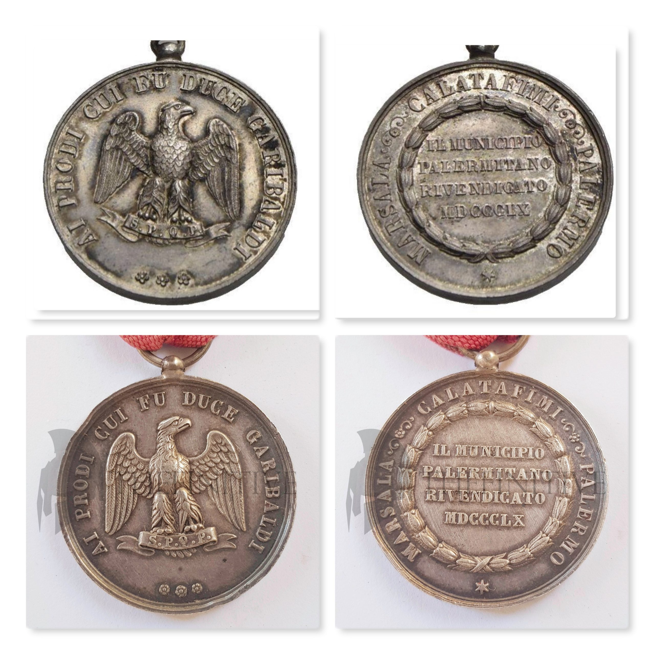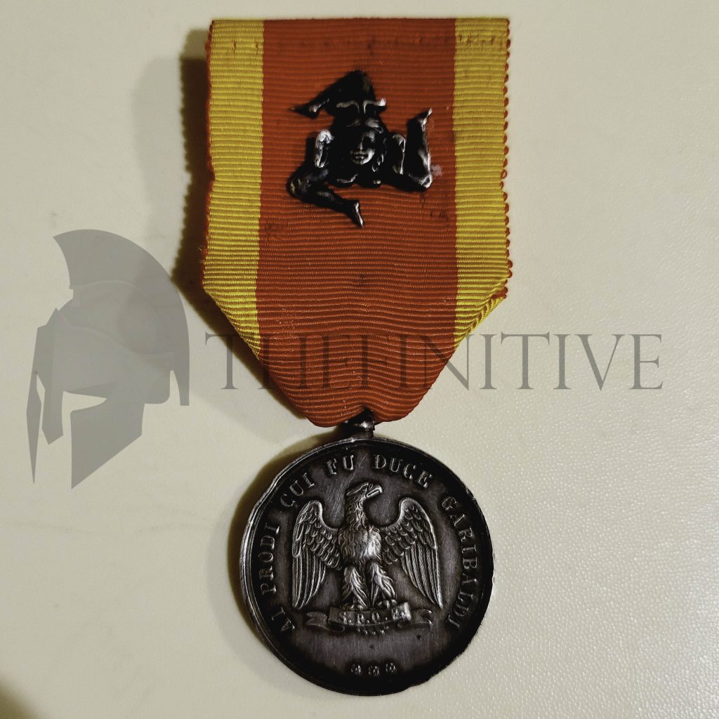 Medaglia originale attribuita ad uno dei MILLE di Giuseppe Garibaldi . La medaglia commemorativa dei Mille di Marsala fu concessa dal Municipio di Palermo e confermata dal Regno d’Italia, ai garibaldini che parteciparono con Giuseppe Garibaldi allo sbarco a Marsala per la liberazione dell’Italia meridionale. Coniata dalla Zecca di Palermo , disegnata da Giuseppe Barone, ha le seguenti peculiarità :
