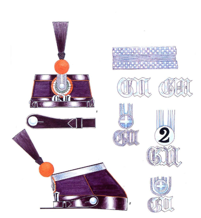 Fregio in metallo stampato recante  GN  per Guardia NazionaleCoccarda tricolore di forma circolare – cappio – nappina di colore rosso. Viene fornito anche il pennacchio di crine nero, da apporsi in cima alla nappina rossa.