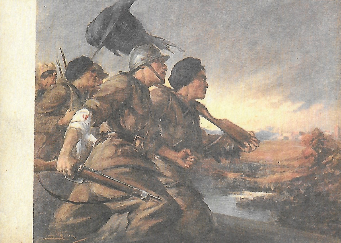 Dipinto originale firmato Clemente TAFURI , dal quale è stata tratta la cartolina della battaglia e della presa di Bilbao o Malaga, ad opera della 2° divisione Camicie Nere denominata FIAMME NERE , durante la Guerra di Spagna del 1936-1939. Questa rappresentazione, potrebbe anche essere rivolta alla 1ª Divisione CC.NN. e ridenominata “Divisione CCNN Fiamme Nere“, mentre combatte a Santander , ma comunque splendido resta il risultato ottenuto dal Tafuri.